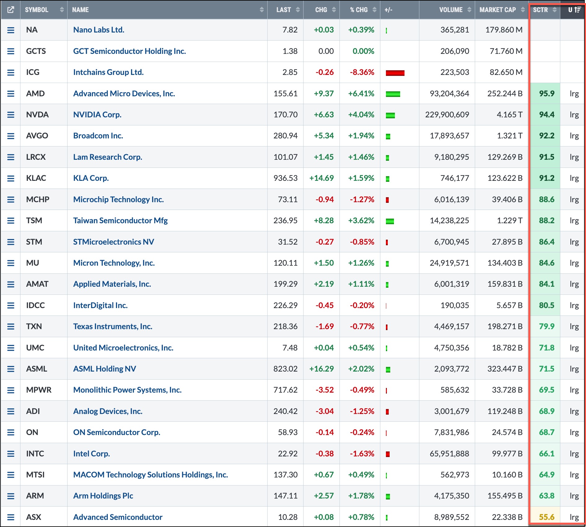 FIGURE 3. SEMICONDUCTOR STOCKS TO REVIEW. The sector drill-down will uncover stocks in leading sectors or industry groups. Scroll down the list to identify charts that meet your investment or trading criteria. Image source: StockCharts.com. For educational purposes.