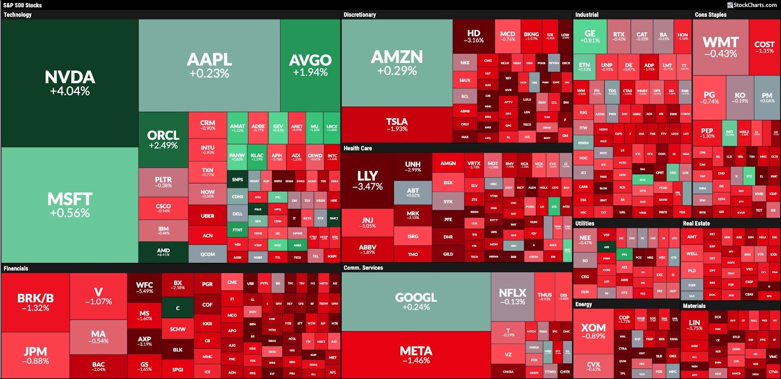 Second, there’s a push from the government to invest in AI and energy initiatives in Pennsylvania. One of the biggest winners was Super Micro Computer, Inc. (SMCI), which jumped 6.9% — the biggest percentage gain in the S&P 500. You can see from the StockCharts MarketCarpet for the S&P 500 stocks that, besides the top-weighted stocks in the index, it was mostly a sea of red.