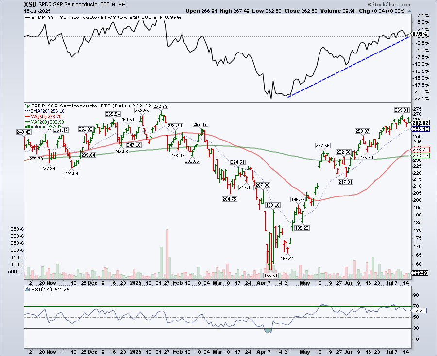 If you’ve been watching semiconductors, you may have noticed that the SPDR S&P Semiconductor ETF (XSD) has been on a roll. Since April, the ETF has stayed above its 20-day exponential moving average (EMA). The relative performance of XSD against the SPDR S&P 500 ETF (SPY) has been improving, and its relative strength index (RSI) is at around 62, an indication that momentum is at healthy levels (see chart below). It’s important to note that since May, the RSI has remained above 50, which is supportive of XSD’s upside movement.