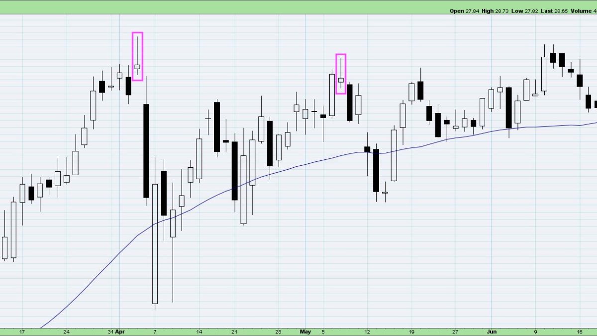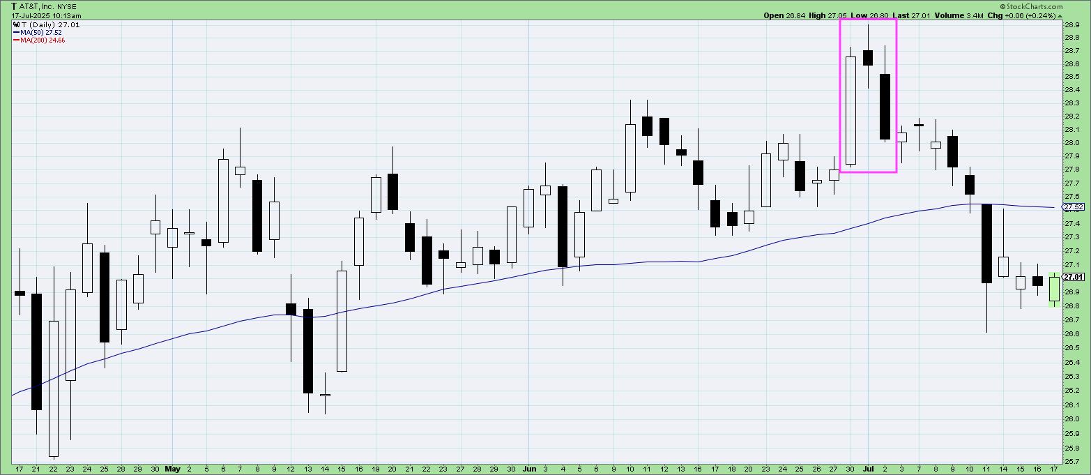 The chart of AT&T (T) has featured a number of shooting star candles so far in 2025. Just before the selloff in early April, there was a clear shooting star candle after the March rally. Then during the rally off the April low, a shooting star pattern in early May suggested that the uptrend phase was nearing an exhaustion point.