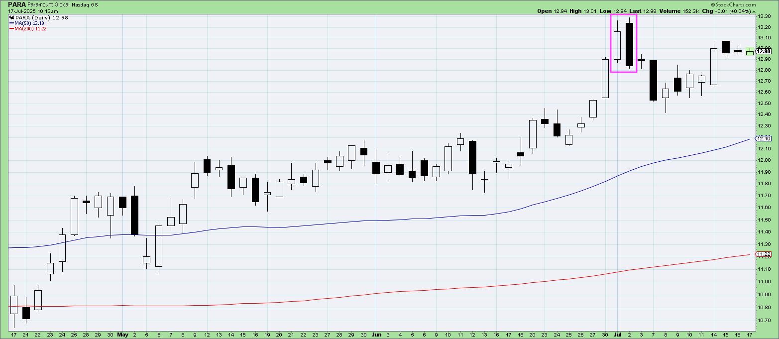 Look at the strength in the uptrend for Paramount Global (PARA) going into early June. Then just before the 4th of July weekend, a bearish engulfing pattern suggests a change of character as the bears take control. It’s worth noting that these candle patterns are not long-term signals, but rather indicate short-term dynamics. So a bearish engulfing pattern suggests weakness for the next one to three bars.