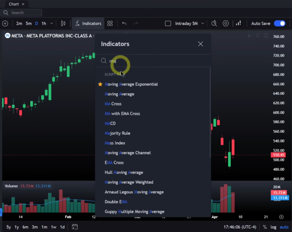 Click the indicators button on your chart to open up the list. The platform uses TradingView-style indicators, which are straightforward to use.