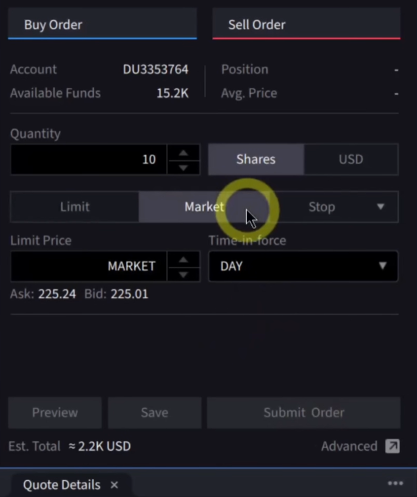 Enter your ticker symbol in the order entry panel to place an order. The panel shows current quote details and lets you set order parameters. Pick your order type depending on your trading plan.